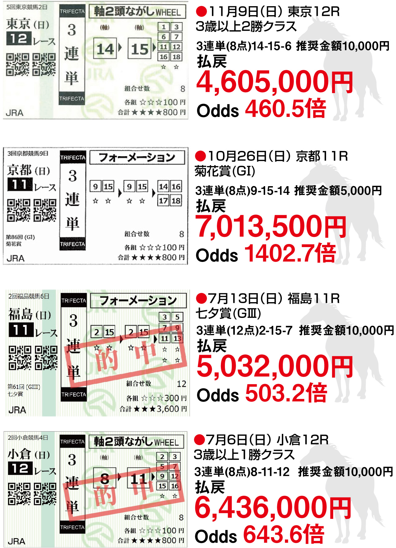 掲載の的中実績は、推奨の金額通りに購入していた場合の試算金額で掲載しております。レースの売上額やオッズ変動の関係で実際の払戻金額とは異なる可能性があります。